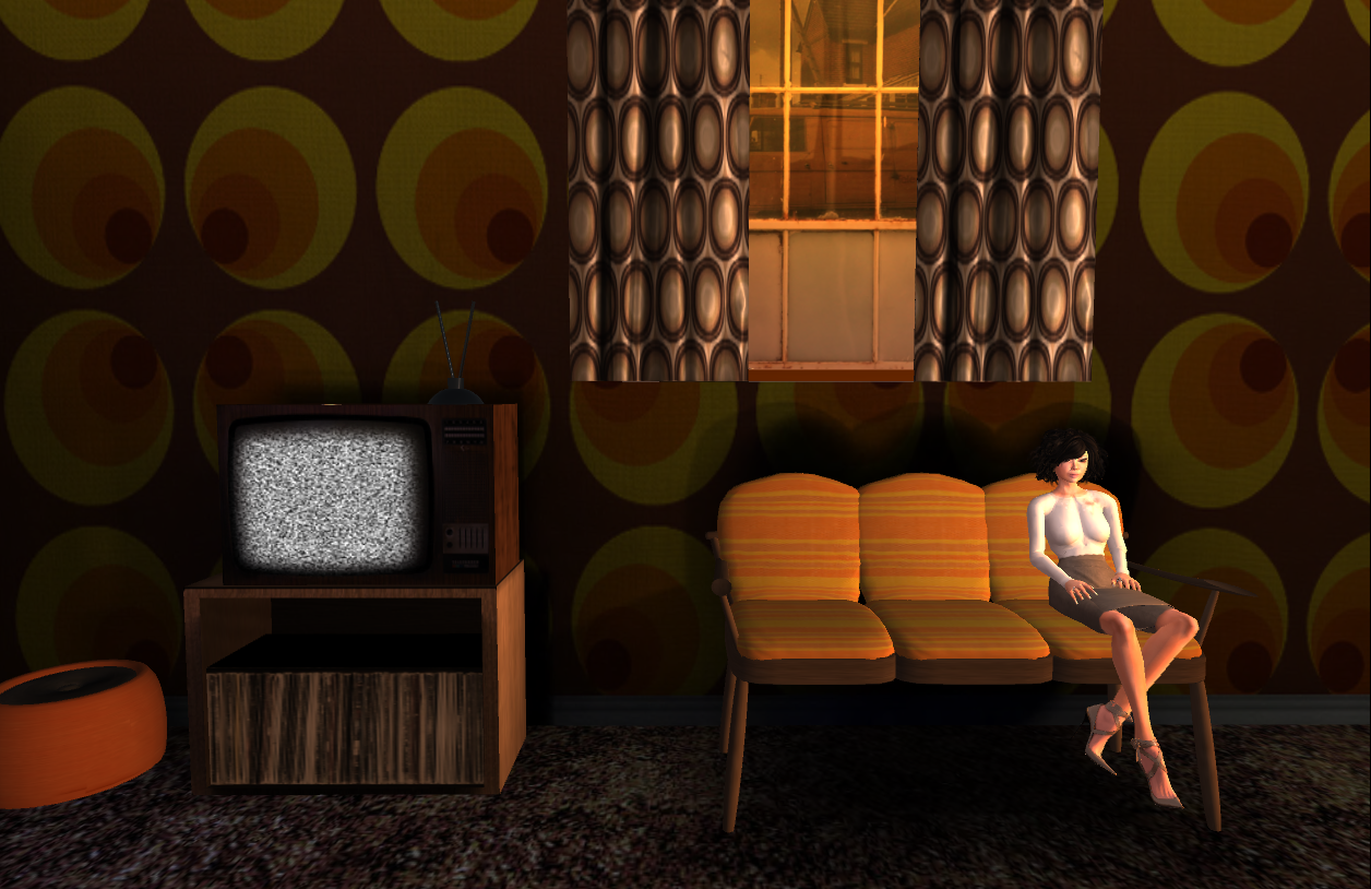 Seventies design at its finest: Wallpaper with huge eyes, lava lamp,